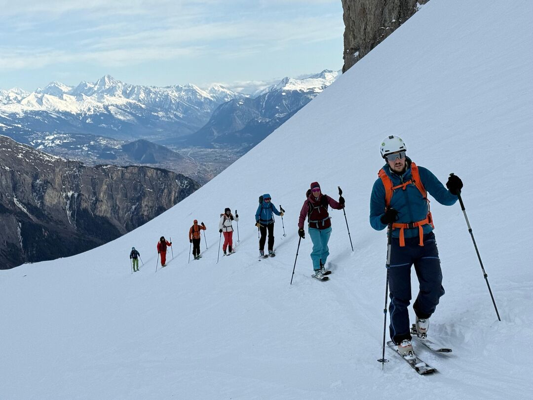 Tout comme le samedi, le rendez vous est fixé au parking de Jorasse à Ovronnaz, à l’arrivée du car postal de 8h45 — ce qui permet à trois participant-e-s, dont un des guides, de venir en bus. Plusieurs participant-e-s ayant participé la veille à l’initiation cascade de glace ressentent encore leurs biceps ce dimanche matin : leur réveil a été plus tardif, car ce petit groupe a pu dormir à Saillon.
