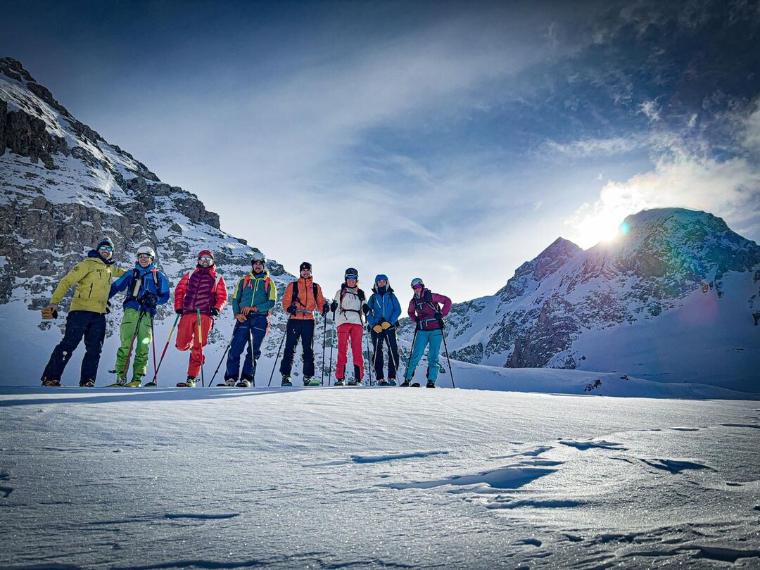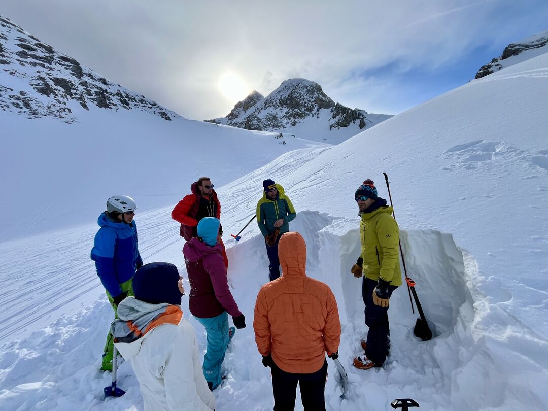Toute l’équipe prend le télésiège et rejoint le restaurant pour un briefing de la journée : évaluation du risque d’avalanche, discussion autour des conditions de la semaine et au sujet de l’itinéraire prévu. La journée se déroule séparément pour les deux groupes, avec des thématiques parfois légèrement différentes mais toutes orientées sur le risque, les conditions, la topologie et la conduite de course. Un profil de neige a mis en évidence une couche fragile à plus d’un mètre de profondeur — de beaux gobelets ont été extraits sous une couche compacte et lourde.