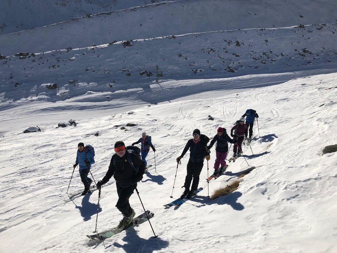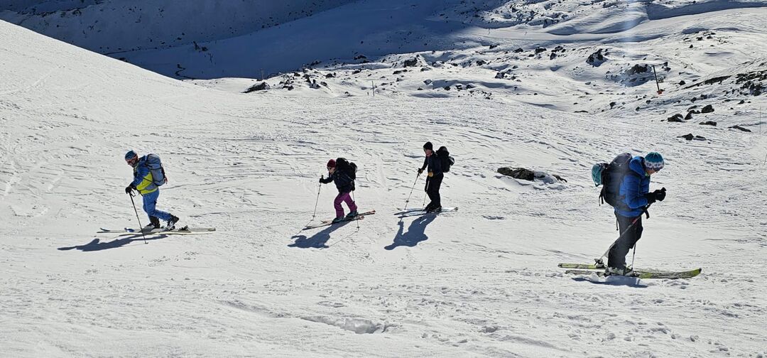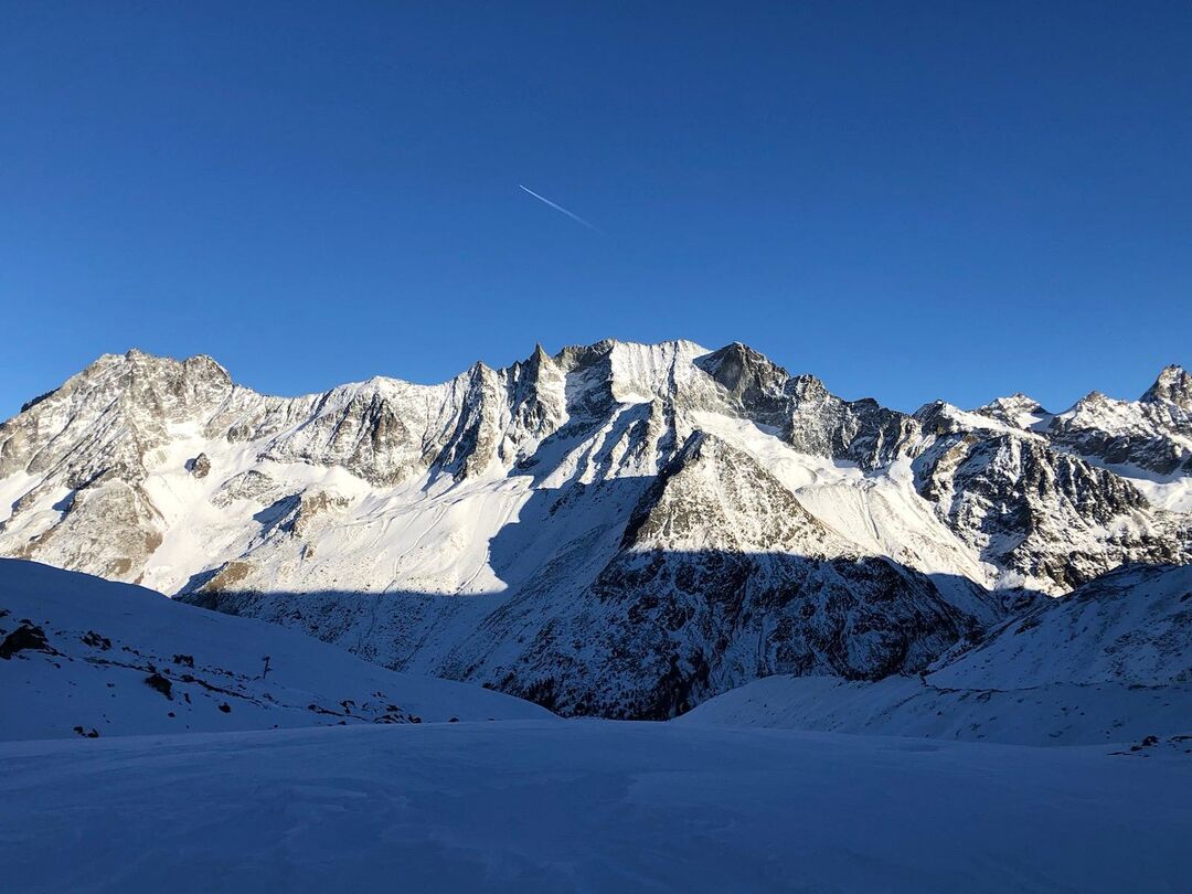 Les températures sont très fraîches et avoisinent les -12 degrés, le temps de coller nos peaux et d’enfiler nos chaussures de ski suffit à nous geler les doigts. Les gros gants sont salvateurs. Arrivés au soleil, c’est un autre monde qui s’ouvre à nous, il fait bon et nous sommes surpris d’enlever presque toutes nos couches. Nous transpirons même à grosses gouttelettes en gravissant le Kilomètre-vertical sous la baraque-restaurant du haut du dernier téléski au col de la Forclette à 2850m.