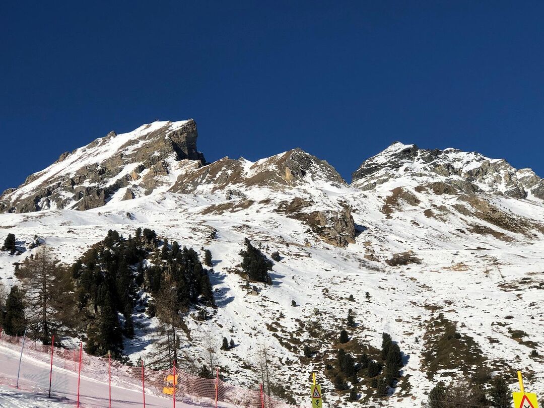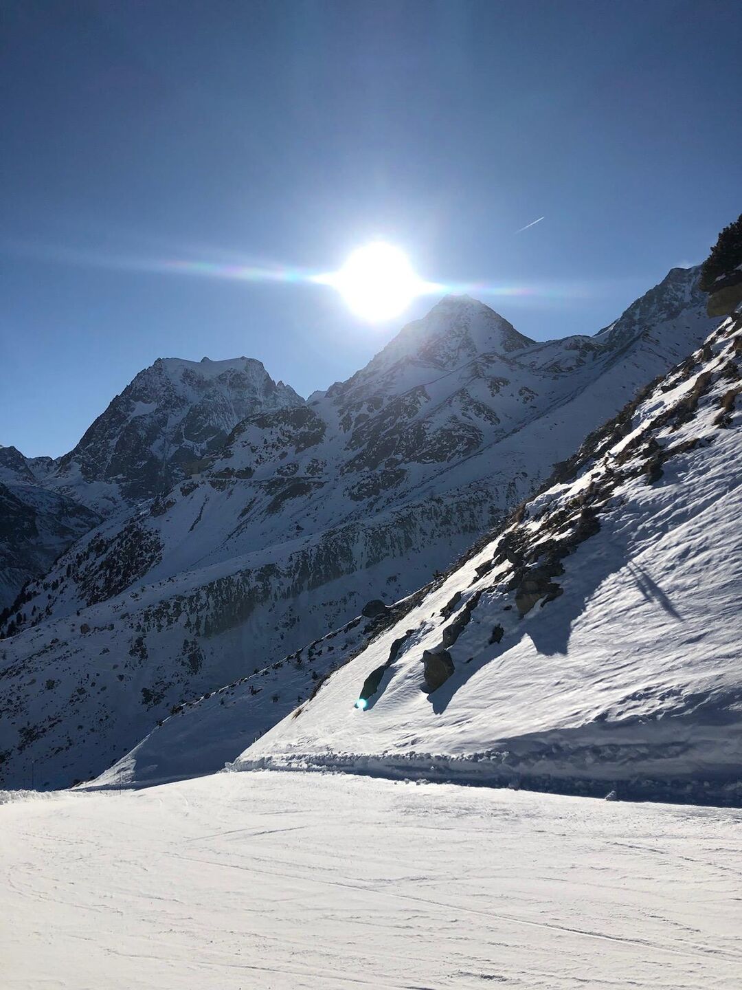 Surprise : nous nous réveillons à la T’Chaux avec 10 cm de neige sur le toit des voitures et partons pour le Valais ensoleillé. Evolène est vert et nous prenons l’option Arolla où les deux groupes se séparent ; grand froid et manque de neige en dehors des pistes damées. Stéphanie nous choisit tout de même une montée hors-piste à l’exception d’un passage et nous progressons en direction du Pas de Chèvre. Le soleil nous aide à supporter les moins douze degrés. La vue des sommets alentours est magnifique, en particulier la face est de la Dent Blanche, les Douves blanches et l’Aiguille de la Tsa. Après 700 mètres de montée, nous sommes rattrapés par l’ombre du Pigne et un vent glacial dévalant la cuvette en amont. Le vrai danger s’appelle « grand froid » et il est unanimement décidé de redescendre par la piste. Les remontées mécaniques vont nous permettre de rejoindre le groupe d’Alain C. sur la terrasse encore ensoleillée du Col de la Forclette.