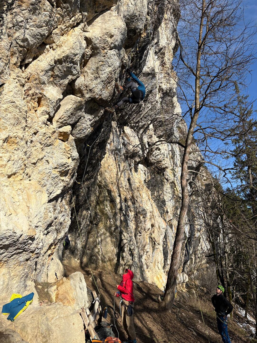 La fonte des neiges ruisselle sur la falaise, il nous pleut dessus et nous pataugeons dans une arène de boue au pied des voies. Mais un grand soleil nous réchauffe et nous flottons au-dessus de la brume ! Nous grimperons presque tous·tes en t-shirt incroyable pour un 29 novembre !