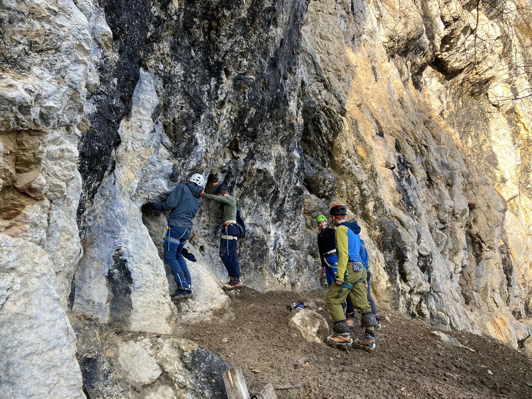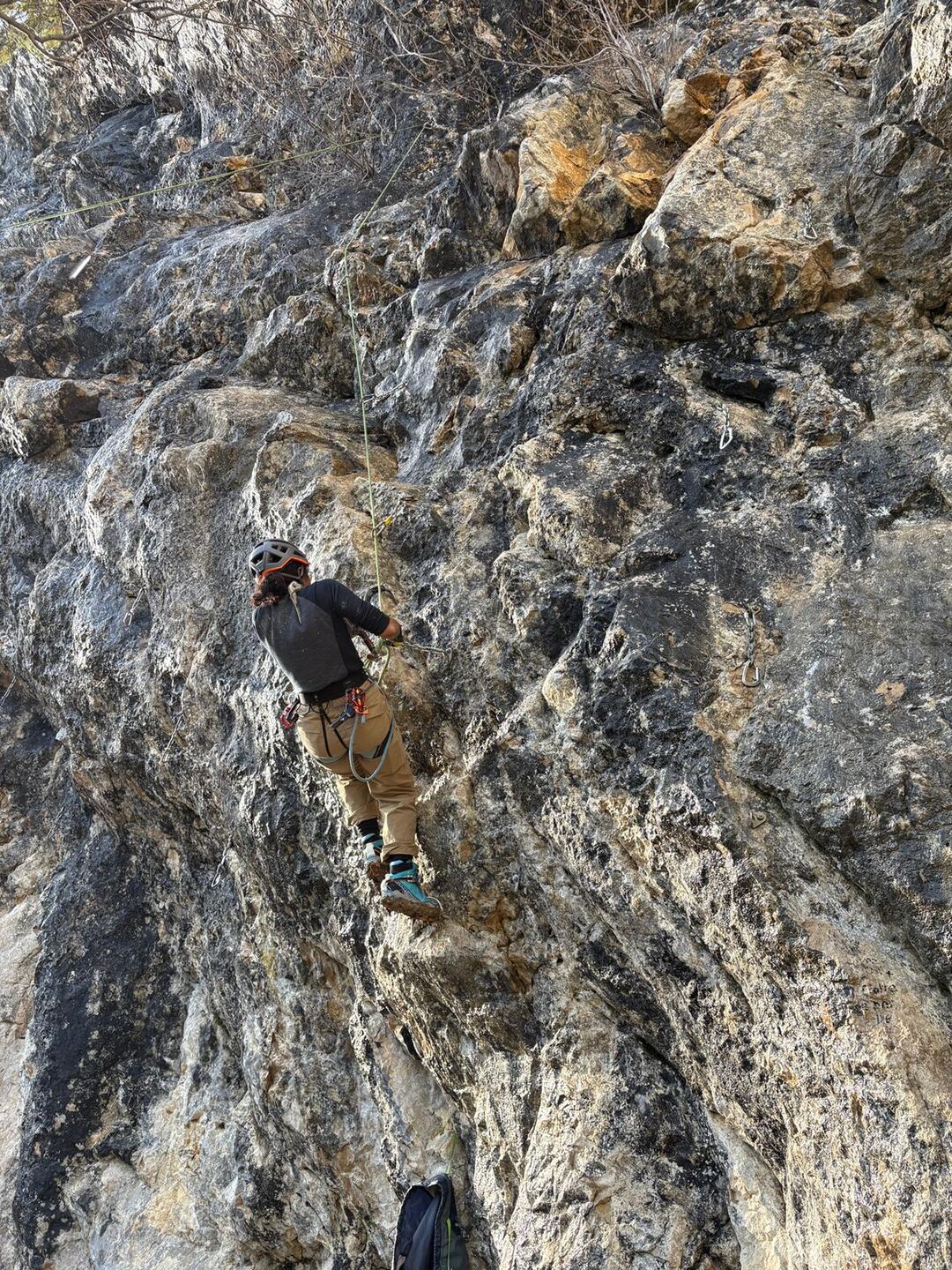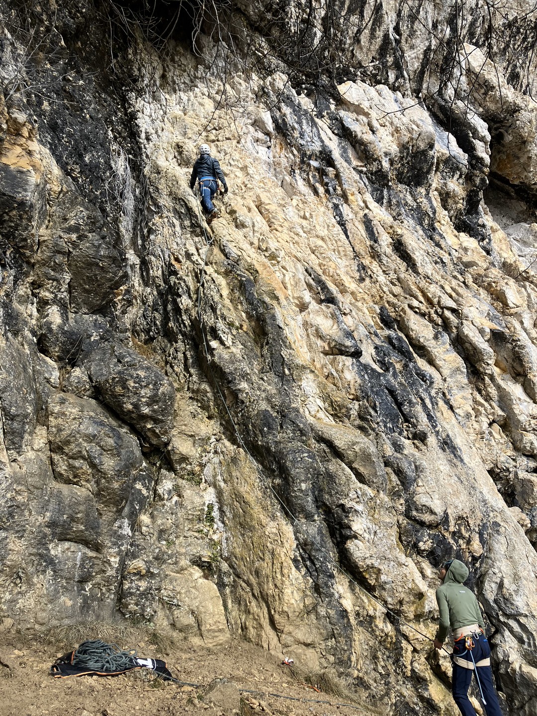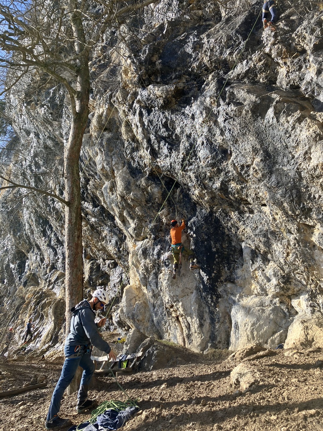 Colin s’attelle à nous poser des cordes en moulinettes, Christophe G assuré par Valentin part en tête à l’intérieur d’une superbe grotte, dont il finira par redescendre après avoir posé un mousqueton pour les seconds. Colin et Julien commencent une voie plutôt déversante (ce n’est pas de la motte ce caillou !) et Christophe H et moi nous lançons dans une voie peut-être avec un sérieux dévers un peu osée pour un échauffement (ou une première en dry pour moi !). Avec un peu de temps tous les seconds réussissent à atteindre le relais et tout le monde est très content ! On change un peu de voies, ma cordée s’aventure dans la voie ouverte par Christophe, sans le dévers, ça devient un peu plus simple !