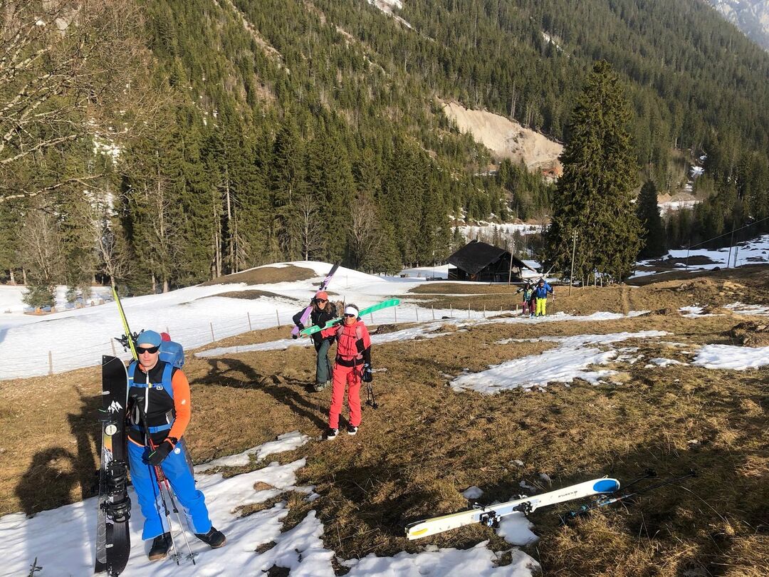 Arrivé à Grimialp, pas de café ouvert, au désespoir de certains, mais cela n'entache pas le plaisir de débuter cette course. Toutefois, au bout de 5 min, il faut déchausser les skis... et c'est parti pour gravir la colline avec les skis sur l'épaule. Je crois que je me suis trompée d’activité …