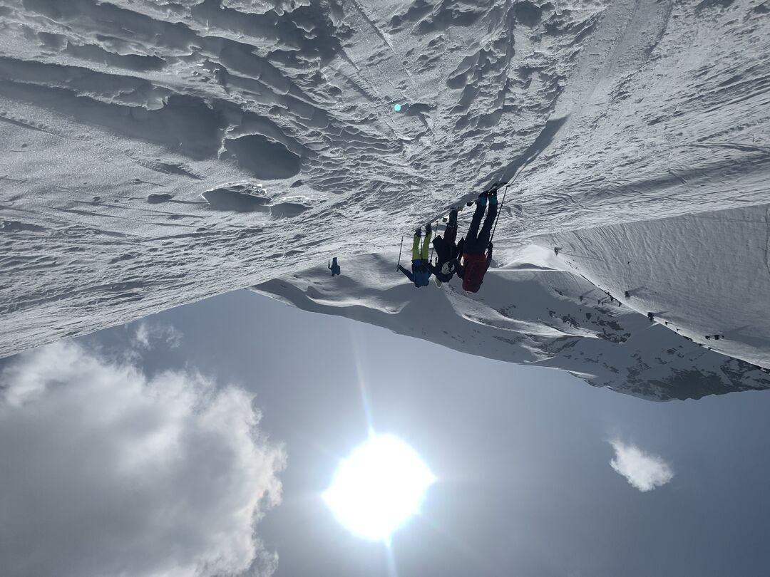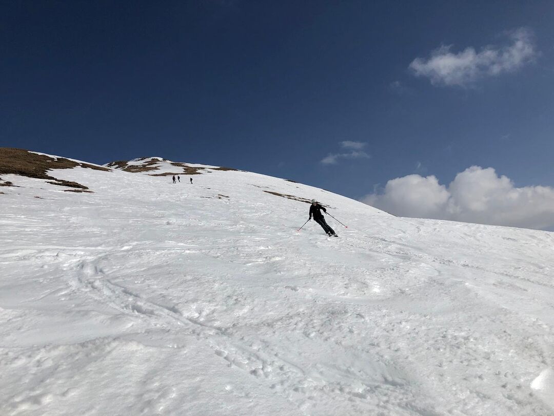 Après les photos, place au plaisir de la descente en présentantnotre plus beau déhanché. La neige du sommet était agréable, printanière. Par la suite, c’était un enchainement de surprises, tout dans la rigolade !! Nous finissons comme nous avons commencé : déchausser, chausser, déchausser, chausser !! Pour le grand plaisir d’Alain ;)
