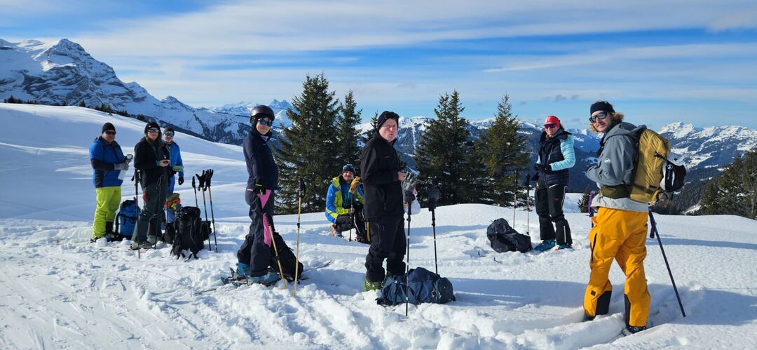 Au sommet de La Palette la vue se dégage à 360° et nous apercevons l’Eiger et le Cervin. Après une descente courte, mais jolie, nous pique-niquons à l’abri du vent. Alain et Patrick profite encore un peu des belles conditions de neige et 10 virages plus tard, nous terminons cette belle journée par un verre à l’Auberge du lac Retaud.