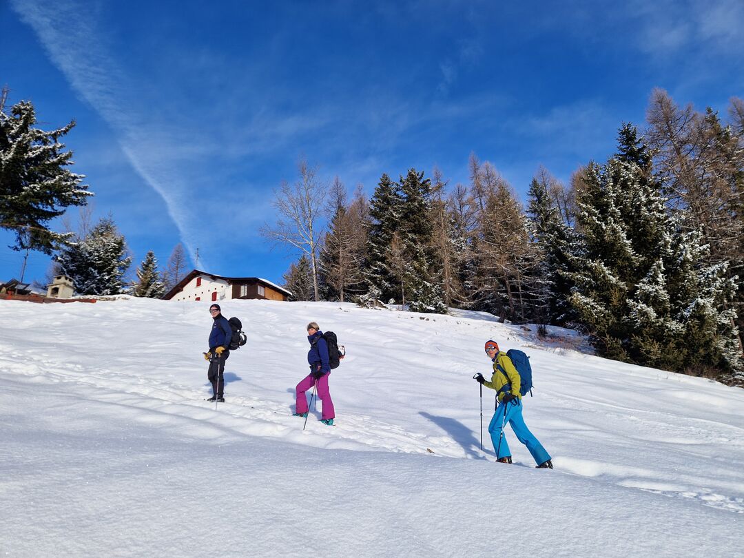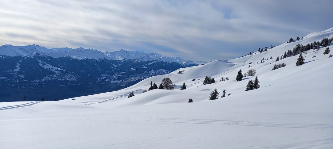 Nous chaussons les skis au lieu-dit Coppet en contrebas des Mayens de My. Dès les premiers mètres de montée dans la forêt, les signes de la dernière chute de neige se font remarquer. Les sapins sont encore bien chargés et une belle couche de poudreuse nous entoure : elle ne nous quittera pas de la journée. Après avoir sillonné entre les sapins, nous arrivons à l’alpage. Pour la suite, la pente reste régulière avec le sommet de la Fava en toile de fond. Toute la montagne semble avoir été recouverte d'une couche de poudre pas soufflée et encore peu tracée. Le groupe reste bien homogène et nous montons à bon rythme. Après un petit rek final, nous nous arrêtons sur un épaulement à 2500m, point final de la journée nous offrant un superbe panorama sur les sommets valaisans.