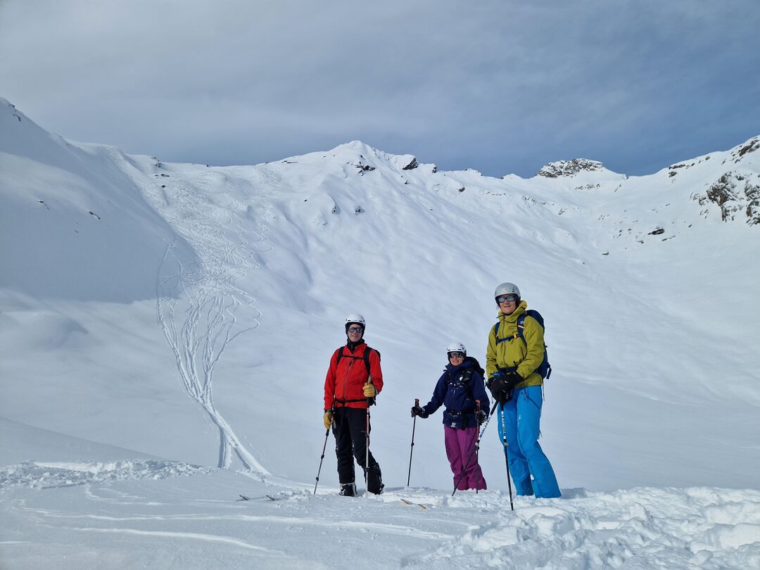 Fred nous guide pour la descente, cherchant les meilleures pentes. Le soleil est là, la visibilité est bonne et la neige parfaite : chaque virage nous rappelle que de telles conditions sont assez rares.