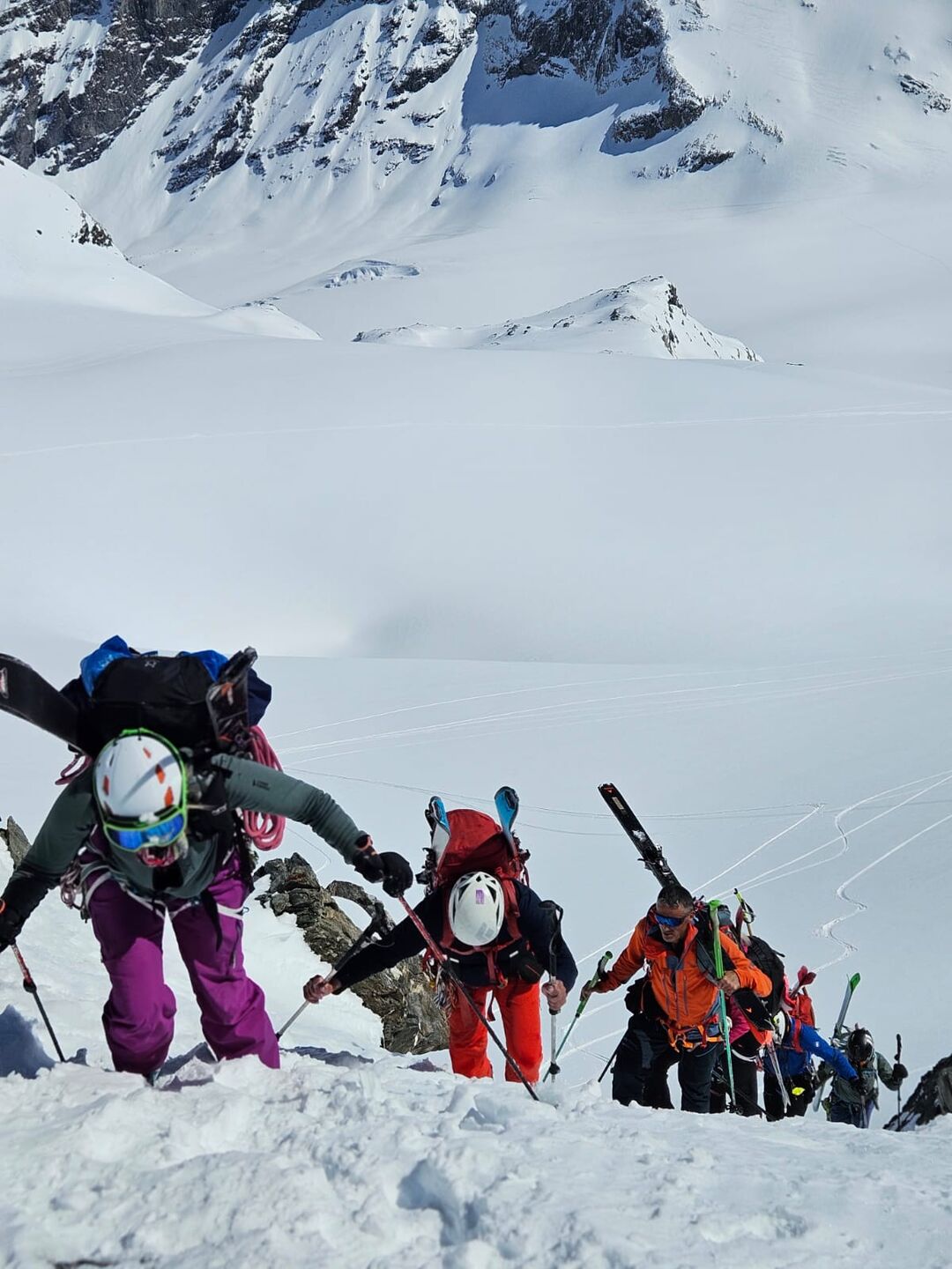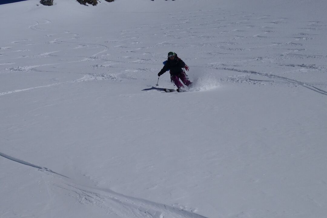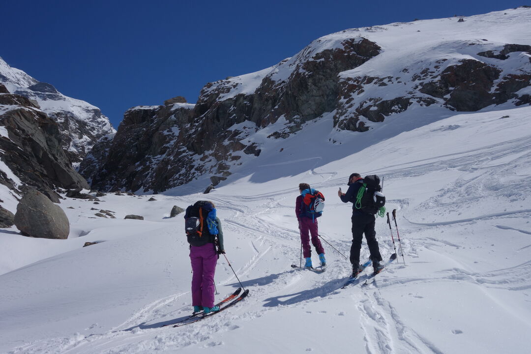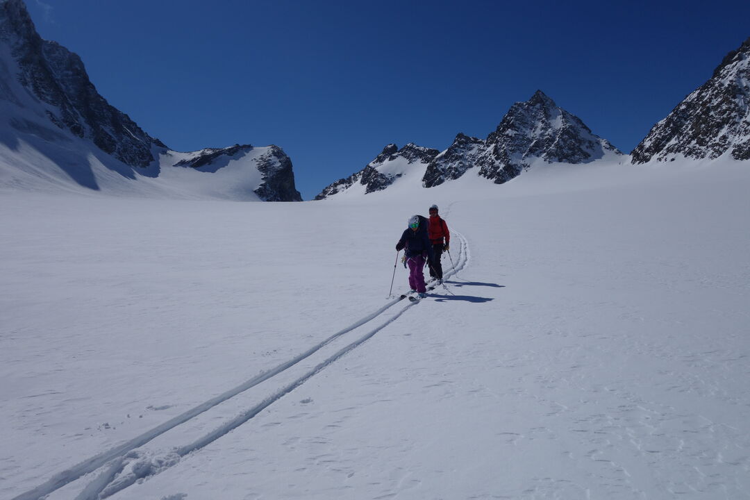 Au col du Meitin, un vent glacial nous accueille, contrastant avec le Soleil et le ciel bleu. Nous descendons tout de suite sur le Plateau des Maisons Blanches pour faire une pause au milieu du glacier, dans un décor himalayen au pied du Grand Combin. S’ensuit la deuxième moitié du plateau, peaux aux skis, puis la remontée du petit couloir très raide sous le col de Panossière.