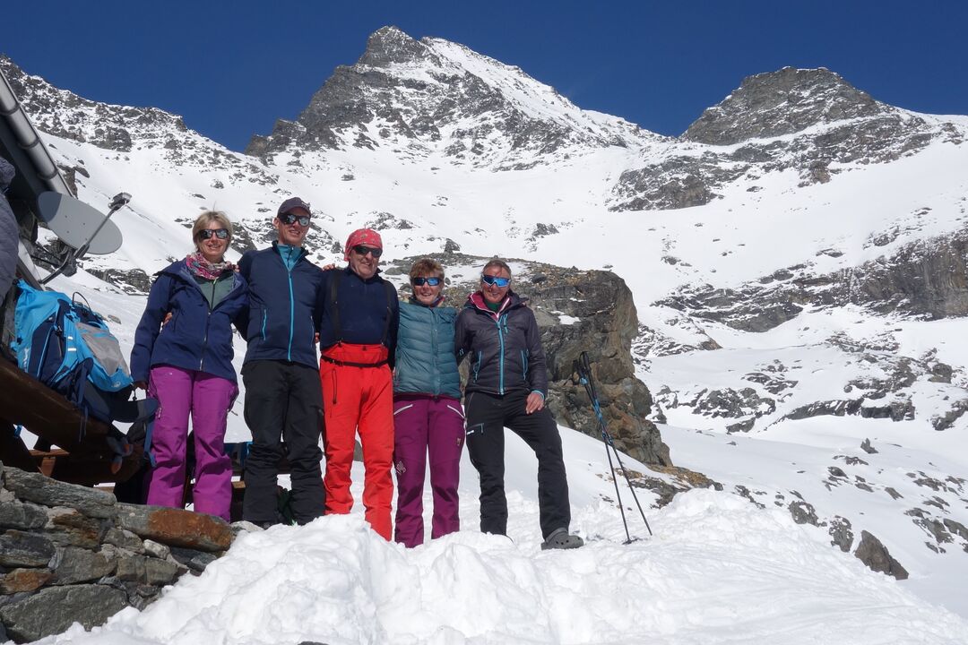 Vendredi Saint, rendez-vous à 9h30 à Bourg Saint-Pierre au Bivouac de Napoléon pour entamer la montée skis aux pieds, d’abord par un froid glacial, puis par un soleil devenant de plus en plus chaud. Les rivières et notamment la gorge après le Chalet d’Amont sont confortablement recouvertes de neige et cela passe bien. Mais comme d’habitude, la montée finale depuis les Grands Plans, sous un Soleil de plomb, nous demande la dernière énergie. Nous sommes récompensés par l’accueil chaleureux de notre gardienne et son équipe ainsi que par une ambiance féerique au coucher du Soleil, avec vue sur le Vélan et le Mont Blanc.