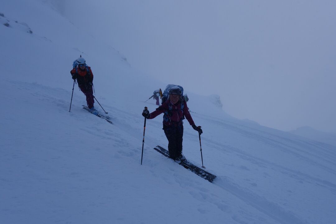 Le lendemain matin, nous partons gentiment après les équipes qui continuent la Haute Route. Nous prévoyons de porter les skis dans la partie la plus raide sous le col du Meitin, mais la neige est trop profonde et nous devons remettre les skis. Alors quel défi de faire les innombrables conversions serrées dans une pente de 45 °. Tomber ou glisser absolument interdit !! Mais un ski de Nine s’en moque et se décroche lors d’une conversion dans la partie la plus raide et dévale la pente pour sauter par la barre rocheuse et disparaître dans le brouillard. Heureusement que Nine a pu s’accrocher, mais elle se trouve avec un seul ski. Que faire ? Marlyse (merci !!!) est d’accord d’accompagner Nine pour retourner à la cabane, crampons aux pieds, où nous espérons que notre gardienne pourra lui prêter des skis. Valentine, Nicolas et moi-même continuons l’ascension vers le Col du Meitin. Bientôt nous devons faire notre propre trace, puisque celle de la Haute Route part à droite vers le Plateau du Couloir. Petit tension nerveuse quand nous traversons, espacés, la pente de plus de 45° dans une neige immaculée direction col du Meitin. Nous sortons gentiment du brouillard et l’ambiance est fantastique, juste ternie par la mésaventure de Nine.