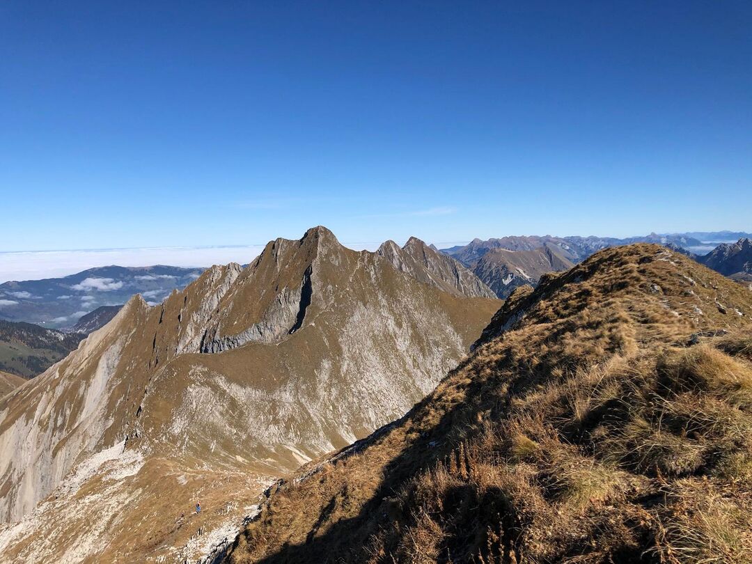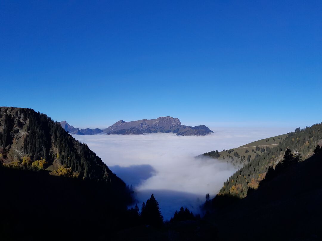 Une journée automnale comme on les aime ! Des paysages colorés, des contrastes, des nuances et une mer de brouillard à contempler voilà le décor du jour ! Une petite équipe de 4, deux participants ayant dû renoncer, s'élance dans la fraicheur matinale à l'assaut du Vanil de l'Ecri. L'ascension se déroule dans des conditions parfaites mais réclamant tout de même une attention soutenue lors de certains passages. Au Plan des Eaux, le panorama est juste grandiose ! On profite du soleil et de l'endroit pour manger un peu avant de finir notre ascension et d'atteindre le sommet du Vanil de l'Ecri à 2376m après plus de 1000m de dénivelé. La descente requiert un pied sûr et les bâtons sont une aide précieuse, mais surtout il faut maintenir sa concentration.